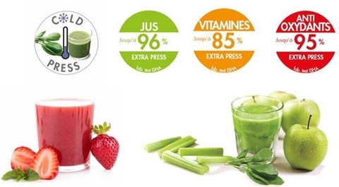 – Máy ép trái cây giàu vitamin (85%) và chất chống oxy hóa (95%), với chiết xuất lạnh (22°), để tận hưởng đầy đủ những lợi ích của trái cây và rau quả.