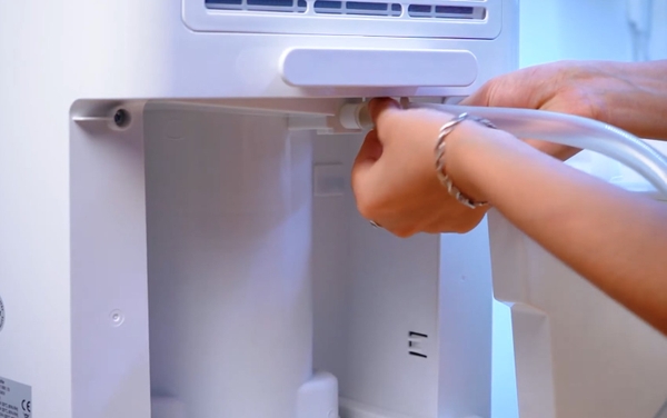 Bình chứa nước của máy sấy khí có thể dễ dàng tháo ra và làm trống. Khi đầy, máy hút ẩm sẽ tự động dừng, biểu tượng ngăn chứa nước hiển thị và có thể nghe thấy 10 tiếng bíp. Nước cũng có thể được xả ra ngoài qua ống xả nước ngưng. Khi thiết bị không được sử dụng, vui lòng đổ hết nước trong bình.