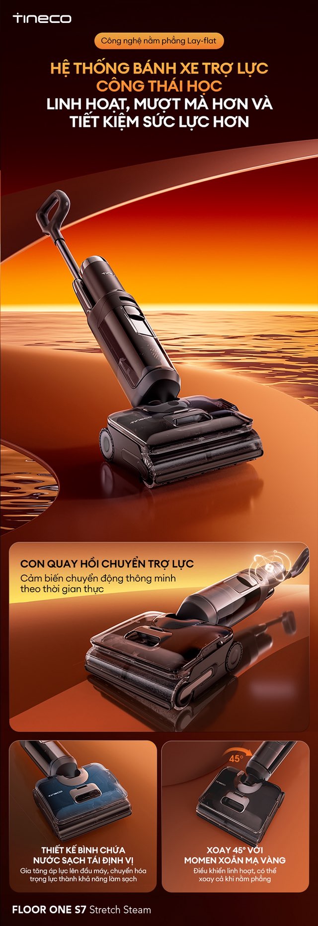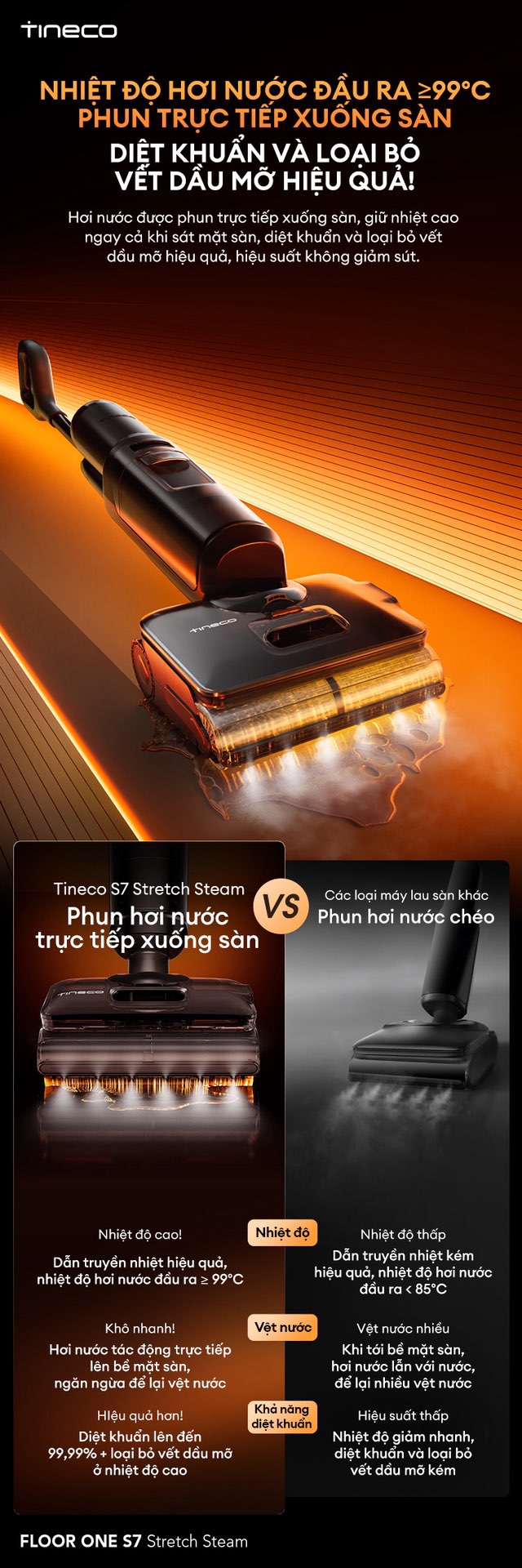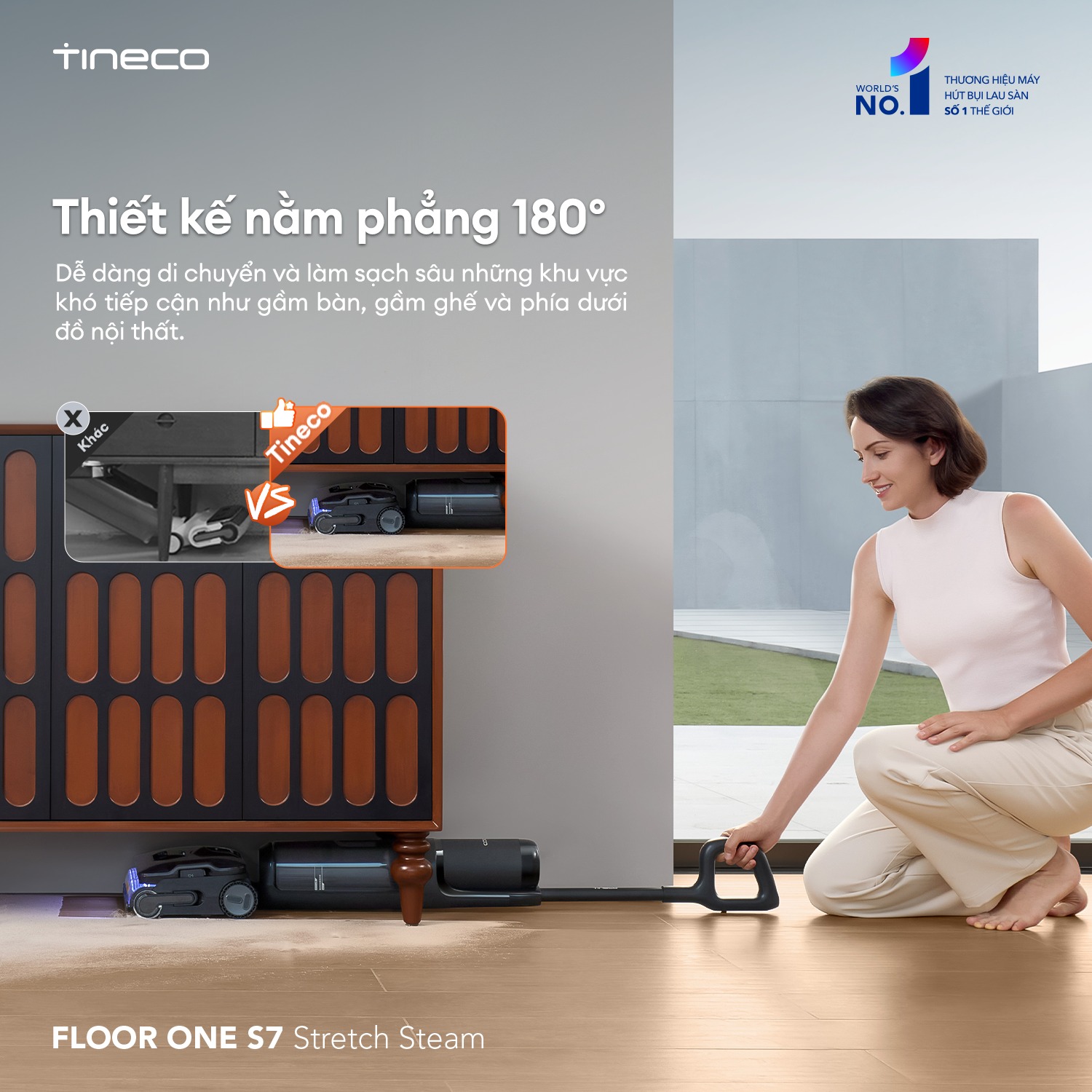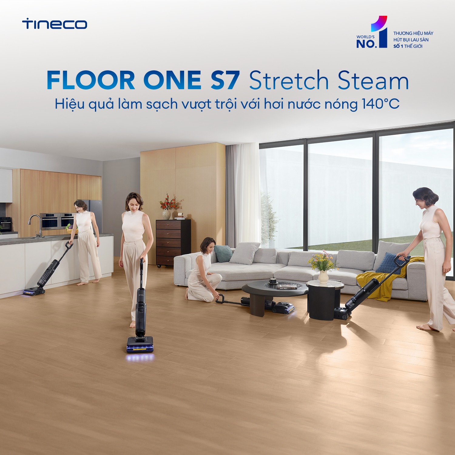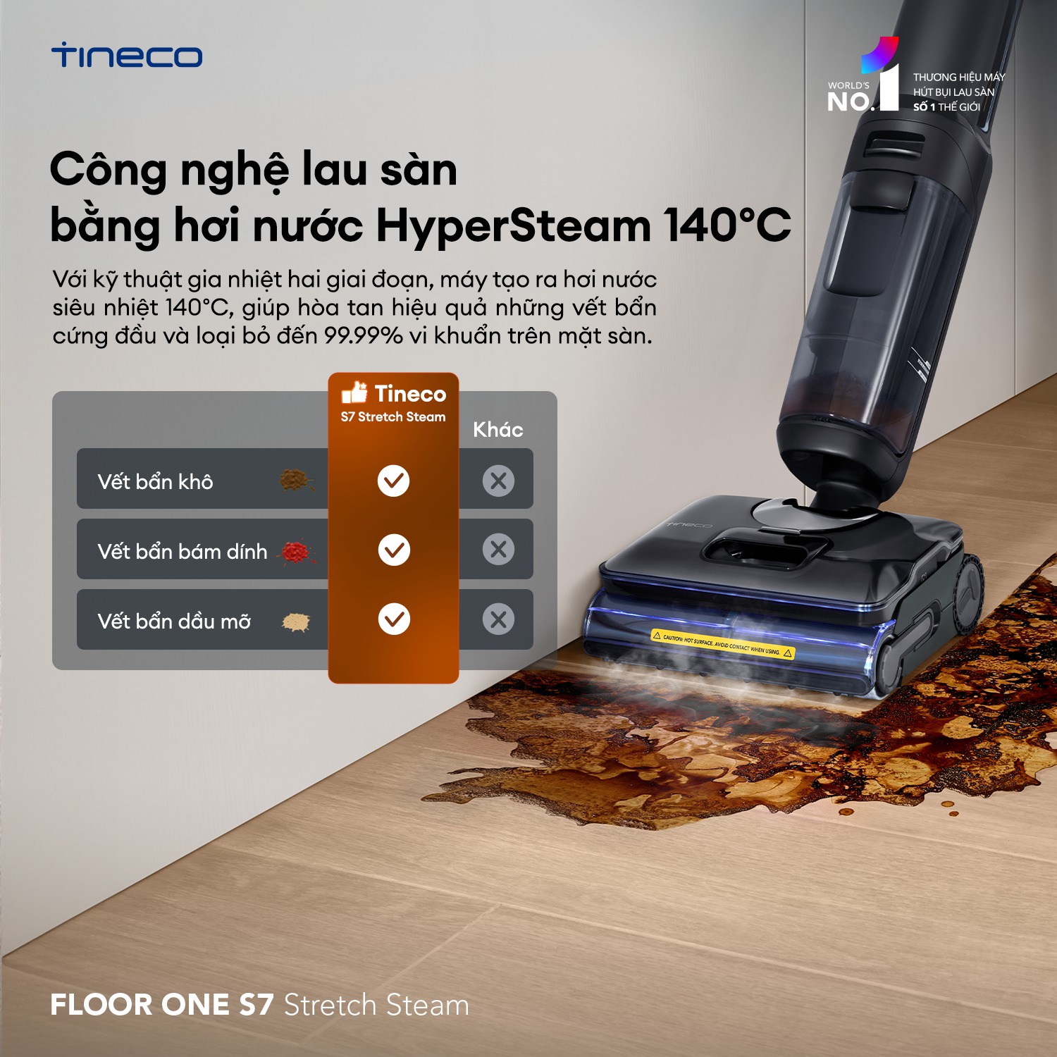 Máy hút bụi lau nhà khô ướt Tineco FLOOR ONE S7 Stretch Steam là giải pháp làm sạch đột phá, mang đến hiệu quả tối ưu cho mọi gia đình. Điểm nổi bật nhất là công nghệ làm sạch bằng hơi nước trực tiếp HyperSteam 140℃, giúp tiêu diệt vi khuẩn và đánh bay mọi vết bẩn cứng đầu trên sàn nhà. Bên cạnh đó, Tineco S7 Stretch Steam được trang bị hàng loạt tính năng thông minh độc quyền, tối ưu hóa trải nghiệm dọn dẹp như lực hút mạnh mẽ 22.000Pa, thiết kế gập phẳng 180° giúp bạn dễ dàng luồn lách và vệ sinh sạch sẽ dưới gầm nội thất, sofa hay những khu vực khó tiếp cận.