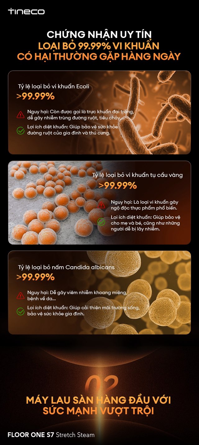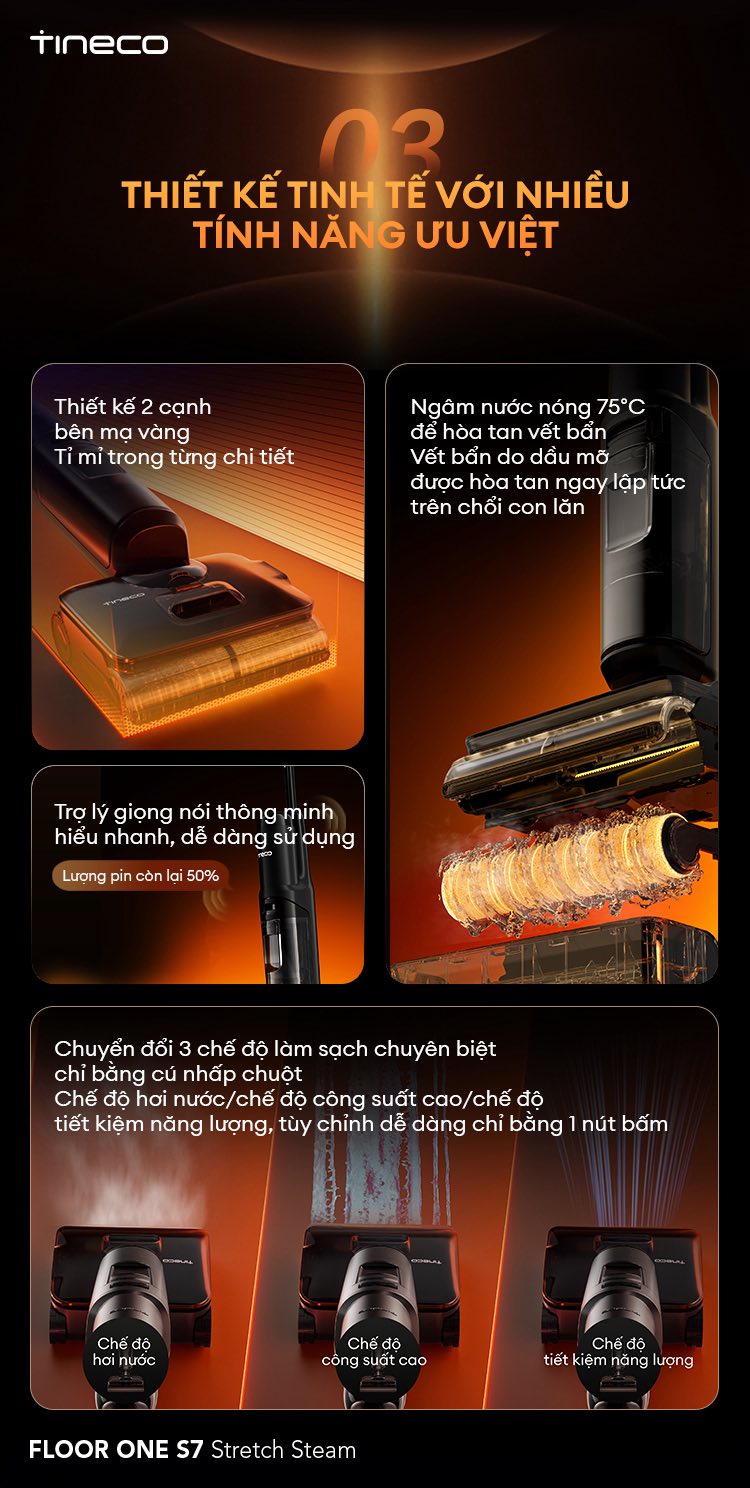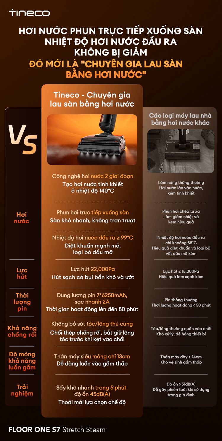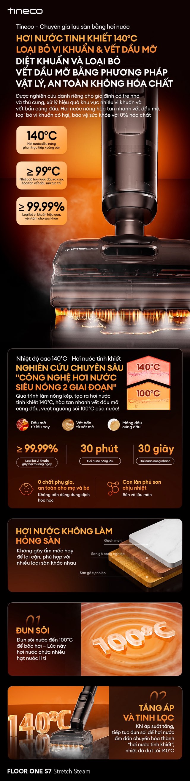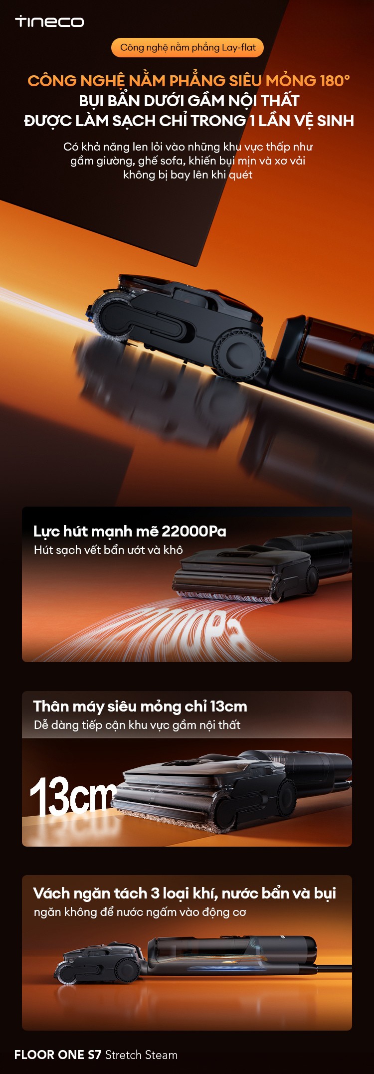 Máy hút bụi lau nhà khô ướt Tineco FLOOR ONE S7 Stretch Steam là giải pháp làm sạch đột phá, mang đến hiệu quả tối ưu cho mọi gia đình. Điểm nổi bật nhất là công nghệ làm sạch bằng hơi nước trực tiếp HyperSteam 140℃, giúp tiêu diệt vi khuẩn và đánh bay mọi vết bẩn cứng đầu trên sàn nhà. Bên cạnh đó, Tineco S7 Stretch Steam được trang bị hàng loạt tính năng thông minh độc quyền, tối ưu hóa trải nghiệm dọn dẹp như lực hút mạnh mẽ 22.000Pa, thiết kế gập phẳng 180° giúp bạn dễ dàng luồn lách và vệ sinh sạch sẽ dưới gầm nội thất, sofa hay những khu vực khó tiếp cận.