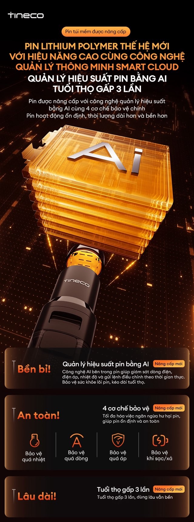 Một cải tiến vượt trội không thể không nhắc đến của Tineco FLOOR ONE S7 Stretch Steam chính là viên pin dạng túi được nâng cấp, mang lại hiệu suất vượt trội và độ bền cao hơn đáng kể. Máy tích hợp hệ thống Quản lý sức khỏe pin bằng AI, giúp giám sát các chỉ số pin theo thời gian thực để tối ưu hóa hiệu suất và kéo dài tuổi thọ.