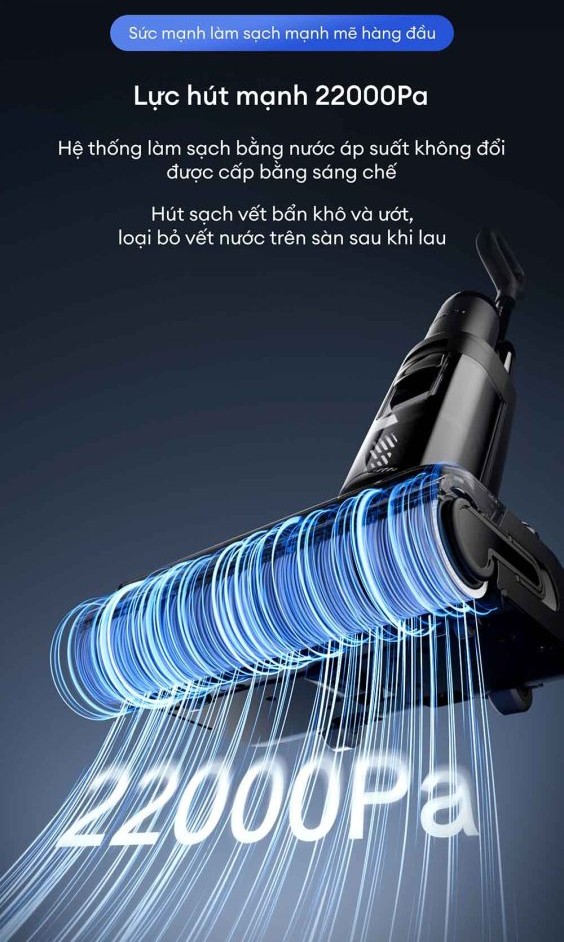 • Lưỡi cạo phẳng cạo sạch nước bẩn, các sợi tóc và chất bẩn cứng đầu, sau đó lực hút mạnh mẽ 22.000Pa sẽ hút sạch chúng vào bên trong.