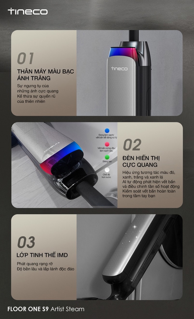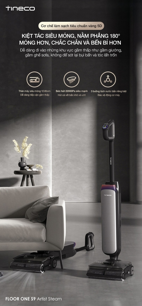 Bên cạnh đó, thiết kế của Tineco Floor One S9 Artist Steam cũng là một điểm sáng khi máy sở hữu độ dày 12.85cm và khả năng ngã phẳng 180°. Ngoài ra, máy còn có công nghệ bánh xe SmoothDrive cho di chuyển mượt mà hơn, kết hợp cùng khả năng xoay 90° vừa giảm lực cầm tay vừa mang lại sự thoải mái khi sử dụng trong thời gian dài. Kết lại, Tineco Floor One S9 Artist Steam là một sự đột phá trong công nghệ làm sạch và được đánh giá là giải pháp làm sạch toàn diện nhất từ trước đến giờ của nhà Tineco.