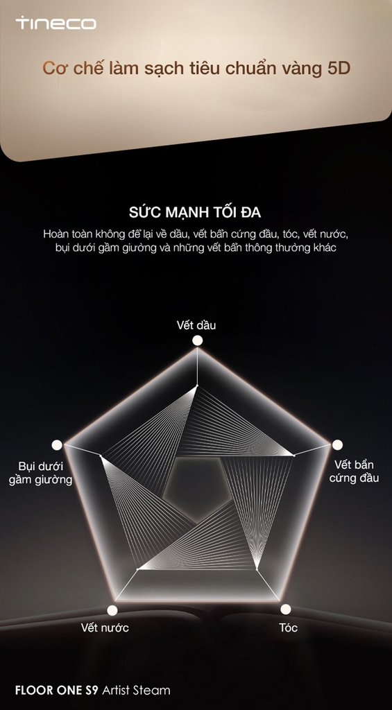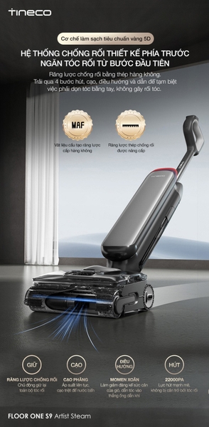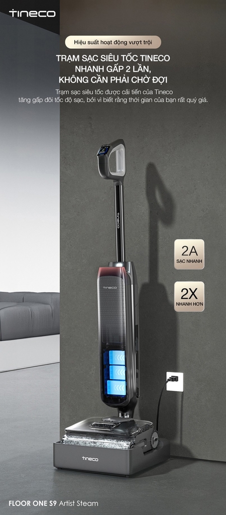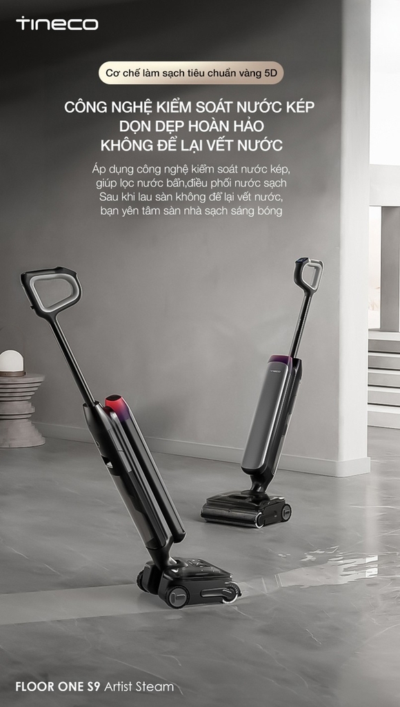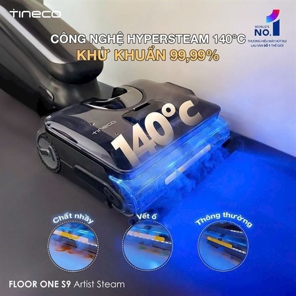 Máy lau sàn hút bụi Tineco Floor One S9 Artist Steam chính là siêu phẩm công nghệ đánh dấu sự bức phá vượt trội của nhà Tineco, giúp thương hiệu này khẳng định vị thế của mình trên thị trường máy hút bụi ngày càng cạnh tranh. Tineco Floor One S9 Artist Steam sở hữu lực hút cực mạnh 22.000Pa cùng với 4 chế độ chuyển đổi linh hoạt, duy trì hiệu quả làm sạch ấn tượng, đánh bay mọi vết bẩn cứng trên mọi bề mặt sàn. Điểm đổi mới độc đáo nhất chính là công nghệ làm sạch bằng hơi nước trực tiếp HyperSteam 140℃, hỗ trợ hoà tan các vết dầu mỡ, đặc biệt ở khu vực nhà bếp. Các công nghệ làm sạch không thể thiếu: thiết kế DualBlock chống rối, hệ thống FlashDry làm sạch và sấy khô nhanh chóng, công nghệ HyperStrech cho khả năng tiếp cận mọi ngóc ngác đều được tích hợp trên Tineco Floor One S9 Artist Steam.
