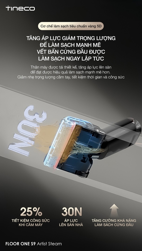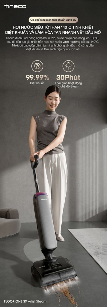 - Với chế độ Steam này, Tineco Floor One S9 Artist Steam sẽ hoạt động liên tục trong vòng 30 phút.