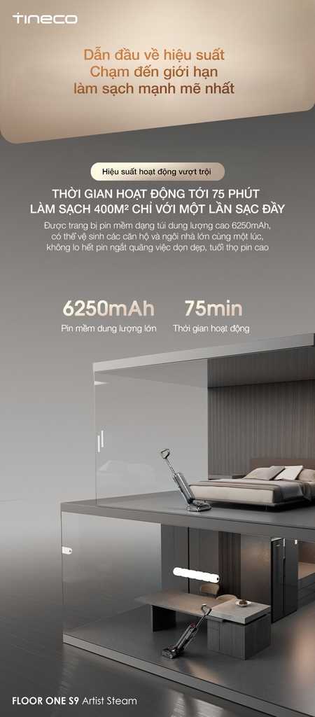 Ưu điểm tiếp theo của Tineco Floor One S9 Artist Steam chính là được tích hợp gói pin mềm có dung luợng lớn lên đến 6250mAh. Dạng pin mềm này sẽ có tuổi thọ vượt trội hơn gấp 3 lần so với các thế hệ pin đời trước, đồng thời khối lượng cũng nhẹ hơn đáng kể. Nhờ đó mà việc điều hướng máy trở nên linh hoạt hơn. Dung lớn pin càng lớn thì thời gian máy Tineco Floor One S9 Artist Steam sẽ càng cao. Theo ước tính từ phòng thí nghiệm máy hút bụi Tineco, máy có thể hoạt động liên tục lên đến 75 phút (trong điều kiện thẳng đứng). Với khoảng thời gian đó, máy có thể dọn dẹp sạch sẽ quy mô diện tích nhà lên đến 400m2 (chỉ với một lần sạc – và chỉ áp dụng trong điều kiện hút thằng đứng).