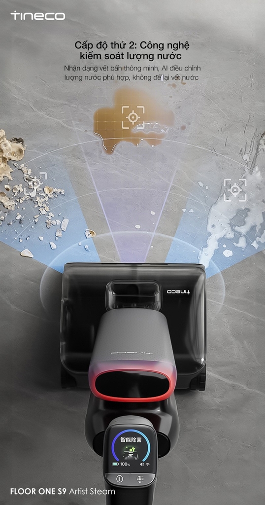 Tineco Floor One S9 Artist Steam tích hợp iLoop™, công nghệ AI cảm biến thông minh. Thiết bị này tự động nhận diện và xử lý các loại vết bẩn trên sàn nhà, từ đó điều chỉnh lực hút và lượng nước phù hợp, đảm bảo làm sạch hiệu quả và không để lại vệt. iLoop™ cũng xác định loại sàn (gạch, gỗ, thảm,...), và tự điều chỉnh chế độ làm việc phù hợp, giúp bảo vệ sàn nhà. Nhờ đó, người dùng không cần tự điều chỉnh, vẫn đạt hiệu quả làm sạch tối ưu.