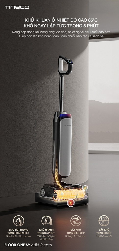 Tineco Floor One S9 Artist Steam mang đến sự làm sạch thông minh, giải phóng bạn hoàn toàn. Chỉ bằng một nút bấm sau khi lau, FlashDry tự động làm sạch sâu bên trong máy, từ đường ống đến chổi lăn. Sau đó, máy dùng khí nóng 85°C sấy khô, diệt khuẩn, ngăn nấm mốc, giữ máy luôn sạch và sẵn sàng. Thiết kế đế của Tineco Floor One S9 Artist Steam dạng kín rút ngắn thời gian sấy khô chỉ còn 5 phút, tối ưu vệ sinh và tiện lợi. Bên cạnh đó, một điểm nổi bật của chổi lăn Tineco là khả năng xoay 720°, cho phép làm sạch sâu và giữ cho các sợi lông luôn mềm mại, thoáng khí hơn so với các sản phẩm khác.