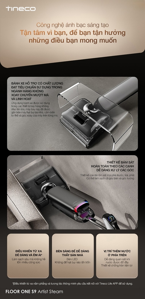 Tineco Floor One S9 Artist Steam cải tiến hiệu quả làm sạch, đặc biệt với khả năng làm sạch 3 cạnh, tiếp cận mọi ngóc ngách như chân tường, đảm bảo không bỏ sót bất kỳ khu vực hay vết bẩn nào. Đèn LED tích hợp giúp phát hiện bụi bẩn, làm sạch triệt để. Máy còn kết nối với ứng dụng điện thoại, cho phép người dùng theo dõi hiệu suất, kiểm tra pin, nhận thông báo và điều chỉnh cài đặt một cách dễ dàng chỉ với vài cú chạm trên màn hình smartphone.