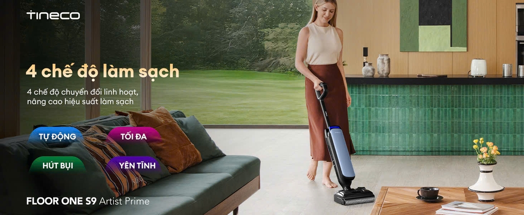 Công nghệ chống rối DualBlock độc quyền và khả năng làm sạch ba mặt cạnh, giúp xử lý gọn gàng mọi loại bụi bẩn, lông/tóc rụng ở các góc tường và cạnh đồ nội thất. Với thiết kế nằm phẳng 180° cho phép Tineco S9 Artist Prime dễ dàng len lỏi dưới gầm bàn ghế thấp. Máy tích hợp chức năng tự động làm sạch FlashDry, giúp giặt sạch, làm khô chổi lăn và bảo trì thiết bị một cách hiệu quả và nhanh chóng. Tineco - Tự hào là thương hiệu máy hút bụi lau nhà khô ướt số 1 thế giới trong 3 năm liên tiếp (Nguồn: Euromonitor International - Theo doanh thu bán lẻ toàn cầu của dòng máy hút bụi lau nhà khô ướt gia dụng năm 2022, 2023 và 2024), cam kết mang lại trải nghiệm làm sạch vượt trội và đáng tin cậy.