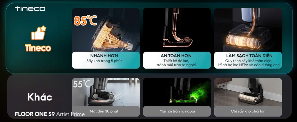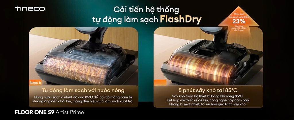 Máy hút bụi Tineco S9 Artist Prime tự động làm sạch bằng nước nóng và sấy khô trong 5 phút với khí nóng 85°C