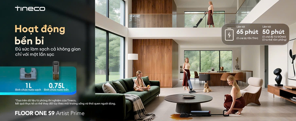 (*Dữ liệu dựa trên kết quả của phòng thí nghiệm Tineco, hiệu suất thực tế phụ thuộc vào môi trường và thói quen sử dụng), cho phép làm sạch toàn bộ ngôi nhà chỉ với một lần sạc đầy.