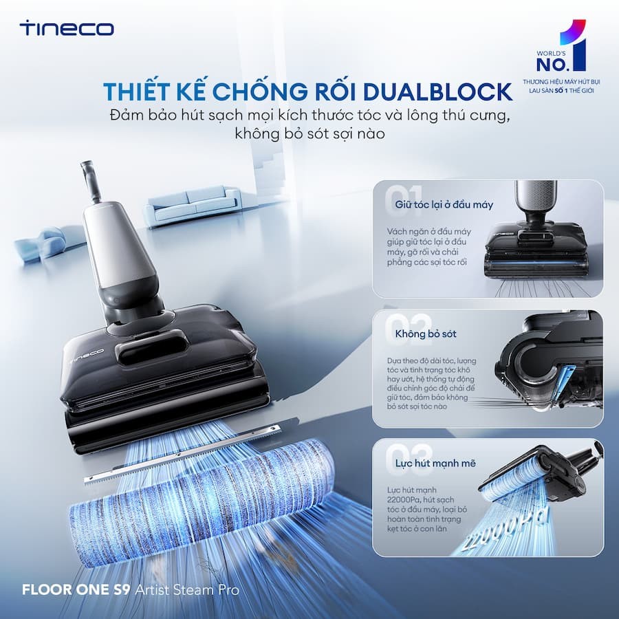 Sở hữu thiết kế chuyên biệt chống rối DualBlock tiên tiến, máy hút bụi lau sàn Tineco Floor One S9 Artist Steam Pro mang đến giải pháp xử lý tóc rụng và lông thú cưng hiệu quả.