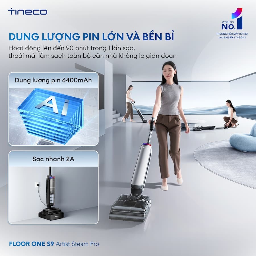 Máy hút bụi lau sàn Tineco S9 Artist Steam Pro kéo dài thời gian hoạt động lên đến 90 phút