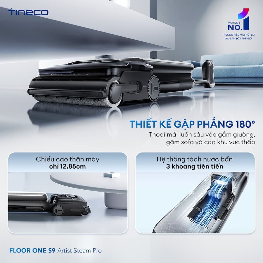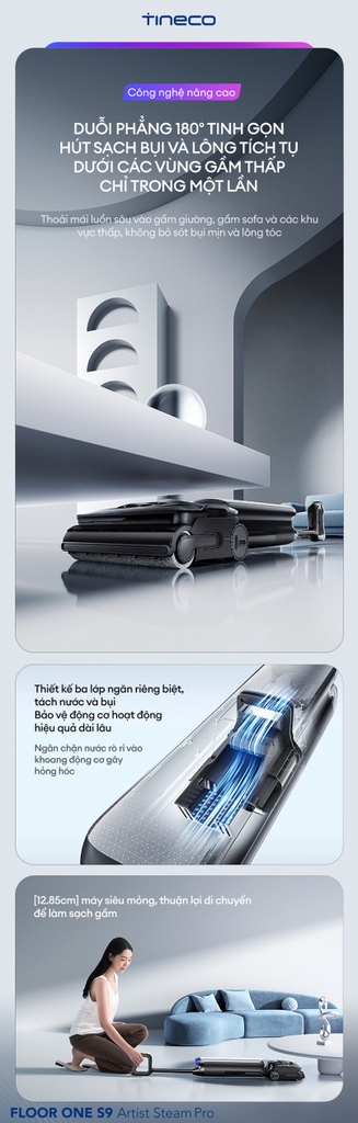Máy hút bụi lau sàn khô ướt Tineco Floor One S9 Artist Steam Pro sở hữu thiết kế đột phá, cho phép duỗi phẳng 180° với chiều cao thân máy chỉ 12.85 cm siêu mỏng. Dễ dàng tiếp cận các khu vực gầm thấp, thoải mái luồn sâu vào gầm giường hay gầm sofa để hút sạch toàn bộ bụi mịn, tóc và lông thú cưng tích tụ chỉ trong một lần thao tác. Bên cạnh đó, máy còn được bảo vệ bằng thiết kế ba lớp ngăn riêng biệt, tách biệt nước và bụi bẩn hoàn toàn. Ngăn chặn hiệu quả nước rò rỉ vào khoang động cơ, đảm bảo động cơ hoạt động hiệu quả và bền bỉ dài lâu.