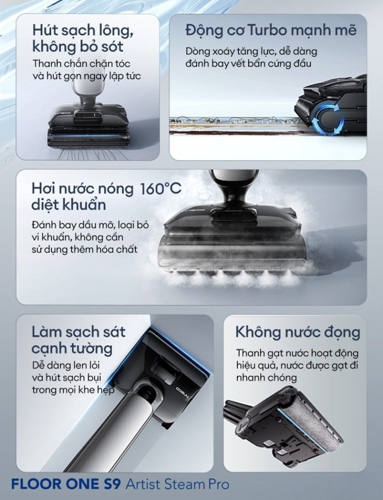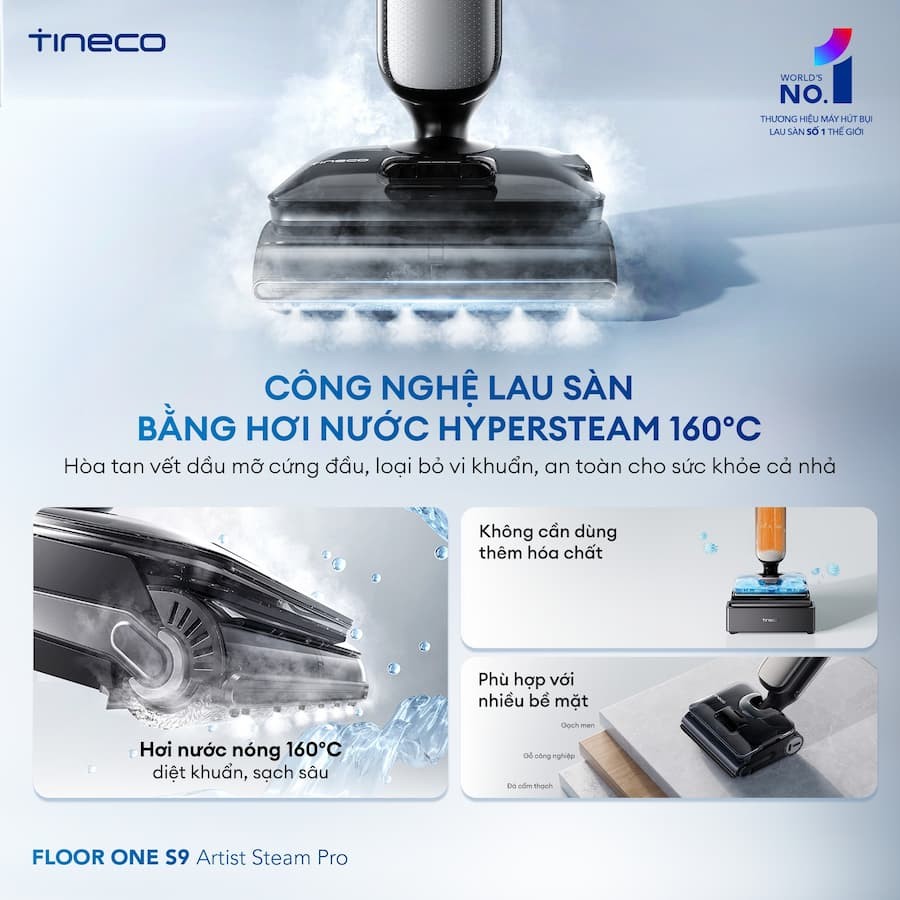 Công nghệ HyperSteam 160°C - một bước tiến mới trong việc làm sạch sàn nhà, đặc biệt là với các vết bẩn cứng đầu và khu vực dễ tích tụ vi khuẩn. Hơi nước siêu nhiệt được tạo ra chỉ trong vài giây, có khả năng làm mềm và tách lớp dầu mỡ, bụi bẩn bám chặt, giúp bàn chải lăn dễ dàng cuốn trôi mọi tạp chất mà không cần dùng hóa chất tẩy rửa. Nhiệt độ 160°C còn giúp máy hút bụi lau sàn Floor One S9 Artist Steam Pro khử trùng bề mặt tới 99%, loại bỏ mùi hôi, nấm mốc – nguyên nhân gây dị ứng và ảnh hưởng đến sức khỏe hô hấp.