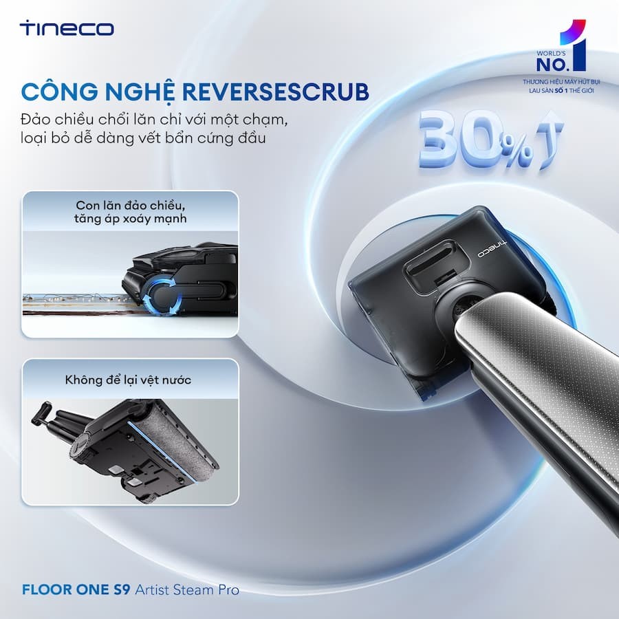 Máy hút bụi lau sàn khô ướt Tineco Floor One S9 Artist Steam Pro sở hữu động cơ Turbo mạnh mẽ, kích hoạt dễ dàng chỉ với một lần chạm. Ở chế độ làm sạch mạnh mẽ, công nghệ ReserveScrub tạo ra dòng xoáy ngược tăng cường, nâng lực chà rửa lên đến 30%, loại bỏ nhanh chóng các vết bẩn cứng đầu, dầu mỡ và cặn khô chỉ trong tích tắc.