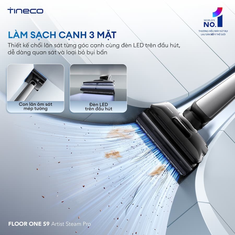 Sở hữu thiết kế làm sạch 3 mặt cạnh tiên tiến, máy hút bụi Floor One S9 Artist Steam Pro tiếp cận sâu hơn, làm sạch triệt để đến từng cạnh viền, dễ dàng quét sạch mọi loại rác và bụi bẩn bám sát tường và ở các góc khuất.