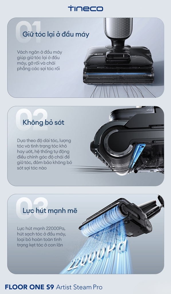 - Hút sạch triệt để: Lực hút mạnh 22.000 Pa nhanh chóng cuốn toàn bộ tóc và lông đã gom vào khoang chứa, loại bỏ hoàn toàn nguy cơ kẹt rối hoặc bít con lăn.