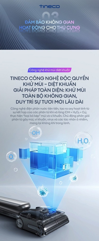 Công nghệ Khử mùi - Diệt khuẩn độc quyền từ Tineco mang đến giải pháp toàn diện giúp không gian sống luôn tươi mới và trong lành. Ứng dụng phương pháp điện phân nước tiên tiến, tạo ra oxy hoạt tính từ sự kết hợp giữa các phân tử khí và lỏng (OH+H2O2+O3), chủ động loại bỏ các phân tử gây mùi, vi khuẩn, virus và các tác nhân ô nhiễm.