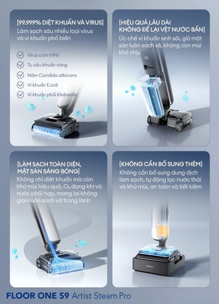 Hiệu quả đã được kiểm chứng với khả năng diệt khuẩn và virus lên đến 99.999%, bao gồm các loại như virus cúm H1N1, tụ cầu khuẩn vàng, nấm Candida albicans, vi khuẩn phổi Klebsiella và vi khuẩn E.coli. Không chỉ làm sạch sâu mà công nghệ còn ngăn chặn sự phát triển của vi khuẩn, giữ cho mặt sàn luôn sạch sẽ và loại bỏ triệt để mùi hôi khó chịu.