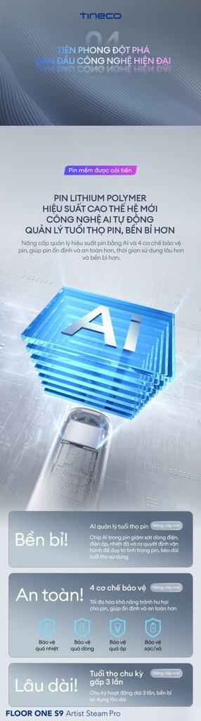 Được trang bị pin thế hệ mới, máy lau nhà cầm tay Tineco Floor One S9 Artist Steam Pro mang đến hiệu suất vượt trội. Điểm đặc biệt nằm ở công nghệ AI thông minh, tự động quản lý tuổi thọ pin. Chip AI tích hợp liên tục theo dõi dòng điện, điện áp và nhiệt độ, từ đó đưa ra các quyết định vận hành tối ưu, duy trì trạng thái pin và kéo dài thời gian sử dụng.