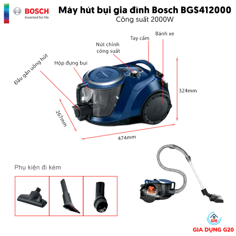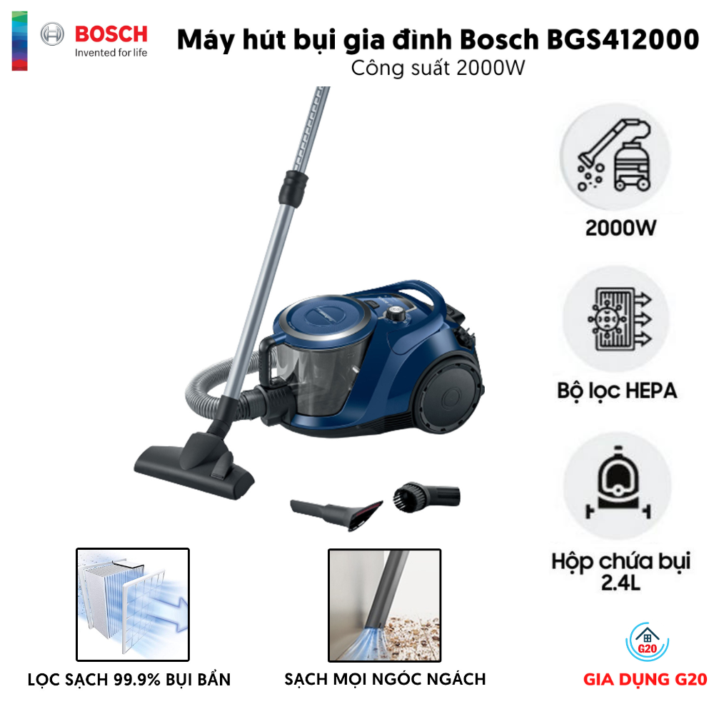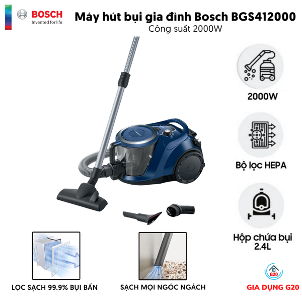 Máy hút bụi Bosch BGS412000 sản xuất theo tiêu chuẩn châu Âu, công nghệ Đức đảm bảo chất lượng và độ bền theo thời gian, có thiết kế thanh lịch, màu sắc ấn tượng chắc chắn sẽ làm hài lòng bất cứ khách hàng khó tính nào, vỏ máy chắc chắn hạn chế bám bụi bẩn, hệ thống 2 bánh xe lớn cùng 1 con lăn hỗ trợ người dùng di chuyển nhẹ nhàng, linh hoạt đến nhiều khu vực trong nhà, dây rút tự động tiện lợi, bán kính làm việc tối đa là 10m, núm điều khiển được thiết kế dạng xoay cho bạn dễ dàng điều chỉnh mức công suất phù hợp, máy còn có tay xách thuận tiện khi cần di chuyển xa một cách nhanh chóng. Trang bị động cơ mạnh mẽ có công suất vận hành tối đa là 2.000W với 5 mức công suất khác nhau từ min đến max, tạo sức hút lớn, dễ dàng hút sạch mọi loại bụi bẩn, bên cạnh đó thiết bị còn trang bị thêm các phụ kiện là đầu hút khác nhau cho phép làm sạch mọi loại mặt sàn, ngóc ngách trong không gian căn nhà của bạn.