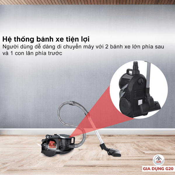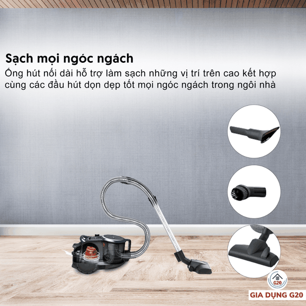 Máy hút bụi này trang bị đầu hút đa năng tăng khả năng hút sạch bụi hiệu quả trên nhiều loại bề mặt. Ngoài ra, máy còn kèm theo đầu hút khe, đầu hút nệm, ghế sopha giúp làm sạch nhiều khu vực khó vệ sinh như các khe nhỏ, ghế sofa…