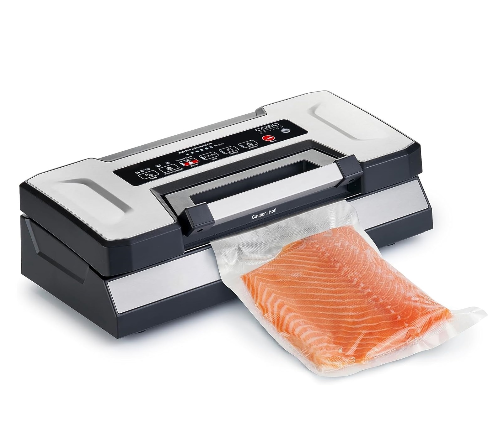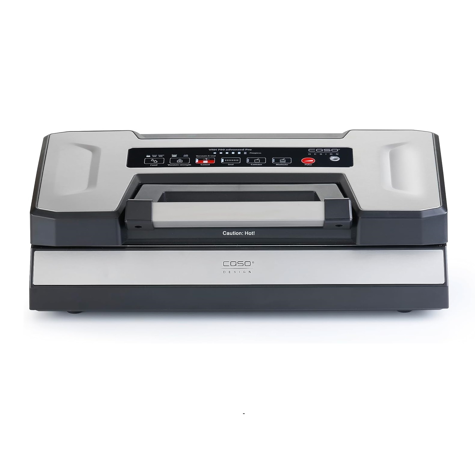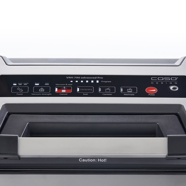 Bảng điều khiển cảm ứng cảm biến với màn hình LED trắng và hiển thị tiến trình hoạt động. Chỉ cần bấm nút, máy hút chân không CASO VRH 790 Advanced Pro sẽ tự động hút kiệt không khí đi ra ngoài, đến một mức độ vừa đủ máy sẽ tự động hàn kín lại miệng túi bảo quản. Sau đó bạn có thể lấy túi mang đi cất trữ bảo quản. Dùng được với túi thực phẩm có chiều rộng lên tới 30 cm và chiều dài không giới hạn. Việc theo dõi nhiệt độ hàn điện tử ngăn chặn các đường mối hàn của túi bị quá nóng gây chảy nhựa.