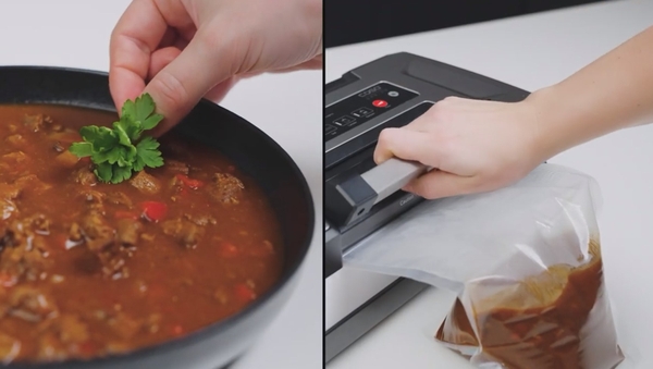 - Để hút chân không các thực phẩm dạng lỏng, chẳng hạn như súp, món thịt hầm hoặc món hầm, trước tiên hãy đông lạnh chúng trong chảo hoặc bát nướng. Hút chân không, dán nhãn và bảo quản trong tủ đông cho đến khi đông cứng.
