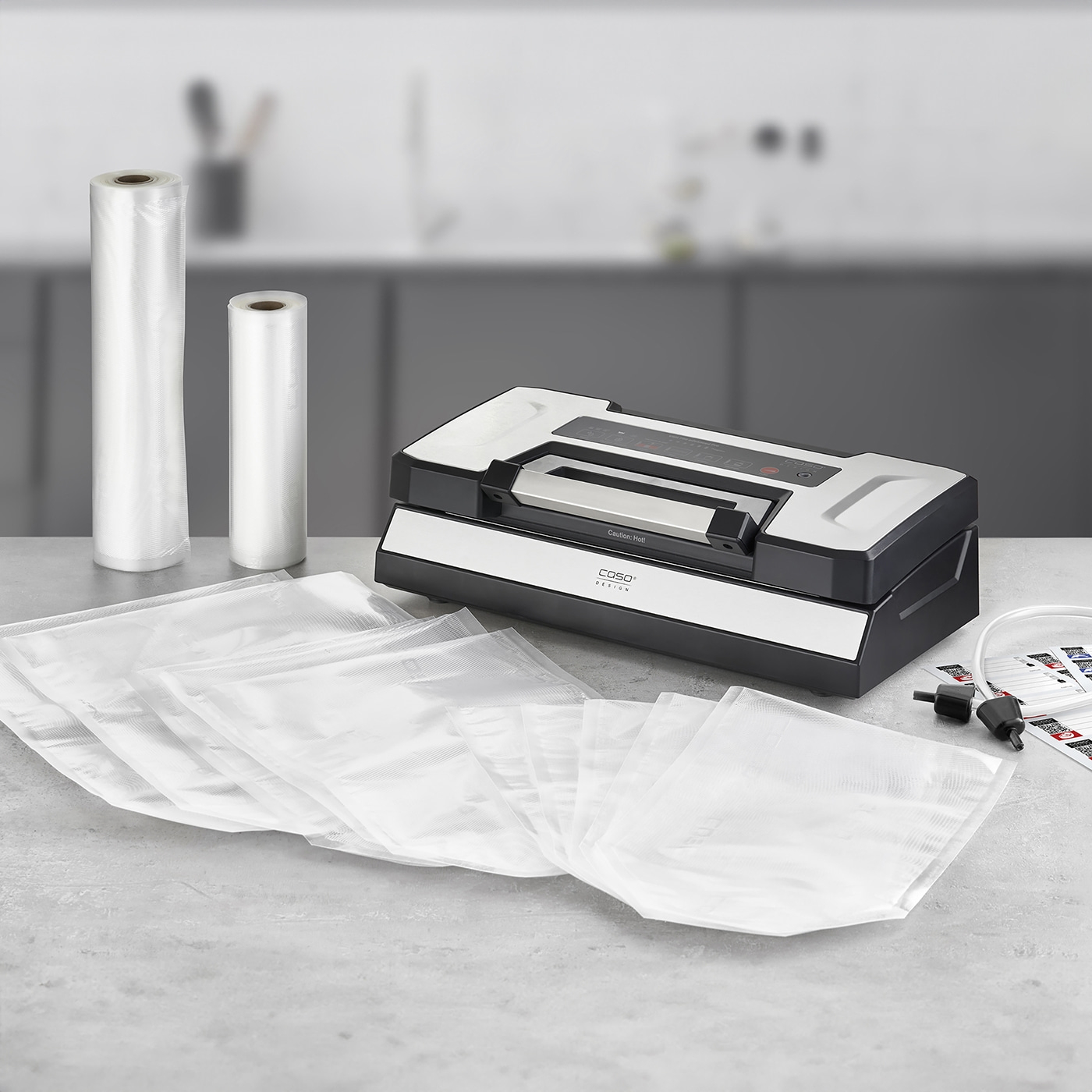 Sản phẩm máy hút chân không CASO VRH 790 Advanced Pro kèm thêm 2 cuộn chân không (20x300 cm, 30x300 cm); 10 túi chân không khác nhau có đế rộng, tiện dụng (5 túi 20x30 cm, 3 túi 25x35 cm, 2 túi 30x40 cm); 1 ống hút chân không cho hộp đựng chân không phù hợp; Nhãn dán CASO Food Manager + Ứng dụng quản lý thực phẩm CASO.