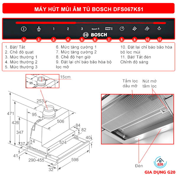 Thông số kỹ thuật chi tiết Máy hút mùi âm tủ Bosch DFS067k51 Serie 8