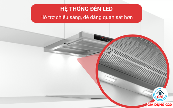 Máy hút mùi âm tủ Bosch DFS067K51 được trang bị hệ thống đèn LED 2 bóng hỗ trợ chiếu sáng tốt. Loại đèn LED được sử dụng cung cấp ánh sáng trắng rõ ràng mà lại tiết kiệm điện. Nhờ đó người dùng có thể dễ dàng quan sát khi nấu nướng, hạn chế sấp bóng, tối trời.