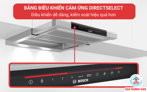 Đặc trưng của dòng máy hút mùi Bosch là áp dụng công nghệ một chạm thế hệ mới. Bảng điều khiển cảm ứng DirectSelect thao tác gọn gàng trên một màn đen sang trọng.