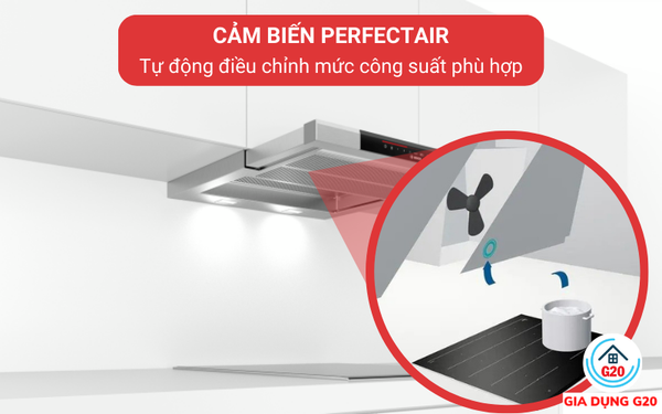 Cảm biến PerfectAir là cải tiến vượt bậc ở dòng máy hút mùi âm tủ Bosch DFS067K51. Nhờ bộ cảm biến này, máy có khả năng tự động chọn mức công suất chính xác nhất để hút hơi nước và mùi. Tính năng này phần nào giúp giảm thiểu tiếng ồn hiệu quả.