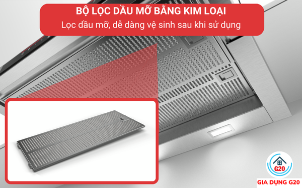 Trên mỗi máy hút mùi âm tủ Bosch DFS067K51 đều được trang bị bộ lọc mỡ kim loại. Nhằm đảm bảo ngăn cản dầu mỡ cùng các chất rắn lọt vào hệ thống ống khí gây tắc nghẽn. Chỉ như vậy thì hiệu suất hoạt động của máy mới đạt trạng thái tốt nhất.