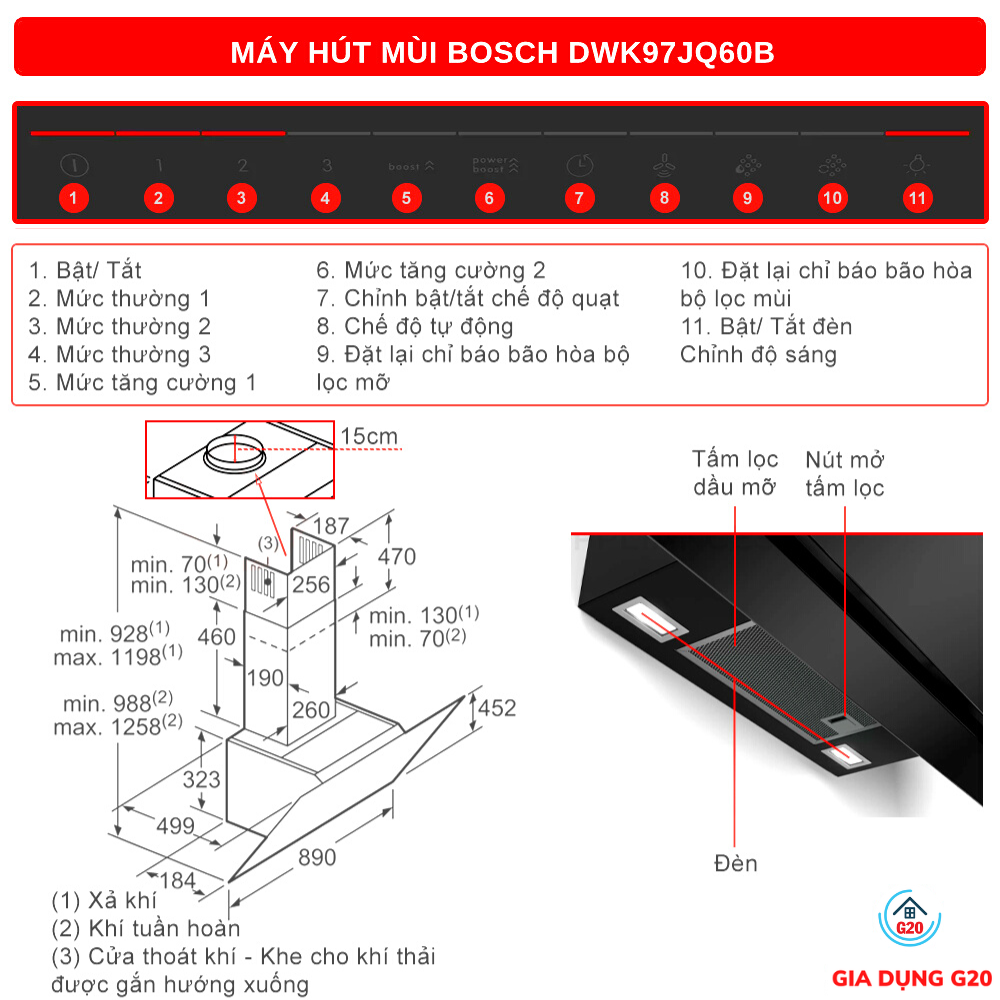 Thông số kỹ thuật MÁY HÚT MÙI BOSCH DWK97JQ60B SERIE 6 NGANG 90CM