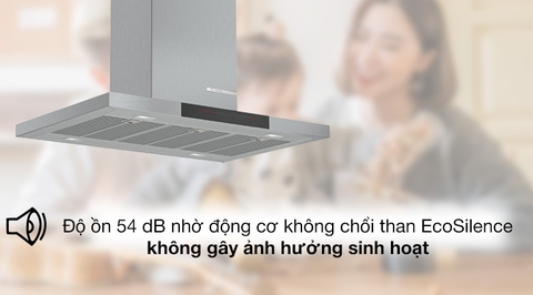 Với Động cơ EcoSilence máy hút mùi Bosch hút Siêu Êm, mang đến cho người sử dụng một không gian nấu vô cùng sảng khoái, đến nỗi gần như bạn như không để ý trong quá trình trò chuyện với người khác là hút mùi đang hoạt động. Trên các mẫu hút mùi có ống khói, 50% tiếng ồn được đưa ra bên ngoài. Với các máy hút mùi bếp Bosch với mô đun CleanAir tạo ra tiếng ồn ít hơn 3 dB (A) so với các hệ thống hút mùi thông thường nhưng vẫn mang lại hiệu suất như nhau.