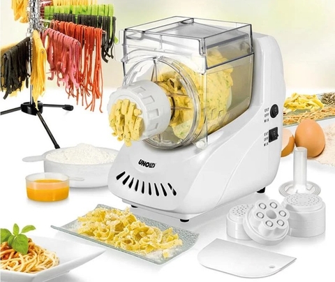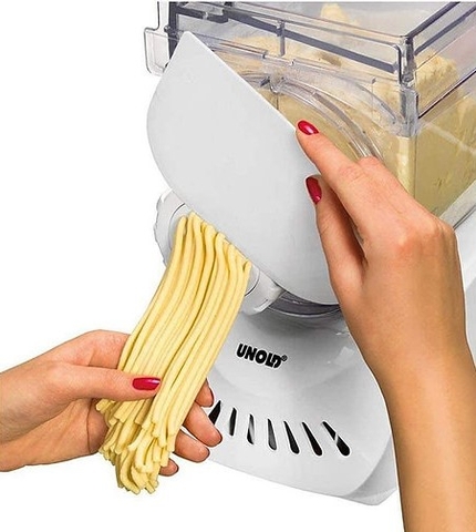 Máy làm mì tự động Unold có thể làm được nhiều loại mì sợi nhờ những đầu ống khác nhau. Máy làm mì Pasta Unold 68801 có thể làm được 500 gram bột mì. Chỉ cần cho các nguyên liệu vào trong máy làm mì Unold và bật nút, máy sẽ tự động nhồi bột sau đó đẩy thành phẩm ra ngoài theo dạng sợi bạn mong muốn. Chỉ mất vài phút là cả nhà có được món mì tươi đầy hấp dẫn.