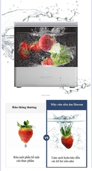 Máy rửa thực phẩm Hurom Ultra Ultrasonic có khả năng rửa sạch bề mặt và dư lượng thuốc bảo vệ thực vật, bụi bẩn và loại bỏ tới 99,99% virut và vi khuẩn có hại. Công nghệ làm sạch ba lần: Làm sạch siêu âm kép mạnh mẽ, nước rửa điện phân ion hydroxit (OH-) và tuần hoàn nước bằng máy bơm 80.000 lần mỗi giây. Máy có thể rửa nhiều nguyên liệu và thực phẩm như: Trái cây và rau củ, thịt cá, hải sản, hạt ngũ cốc, bình sữa trẻ em, …vv