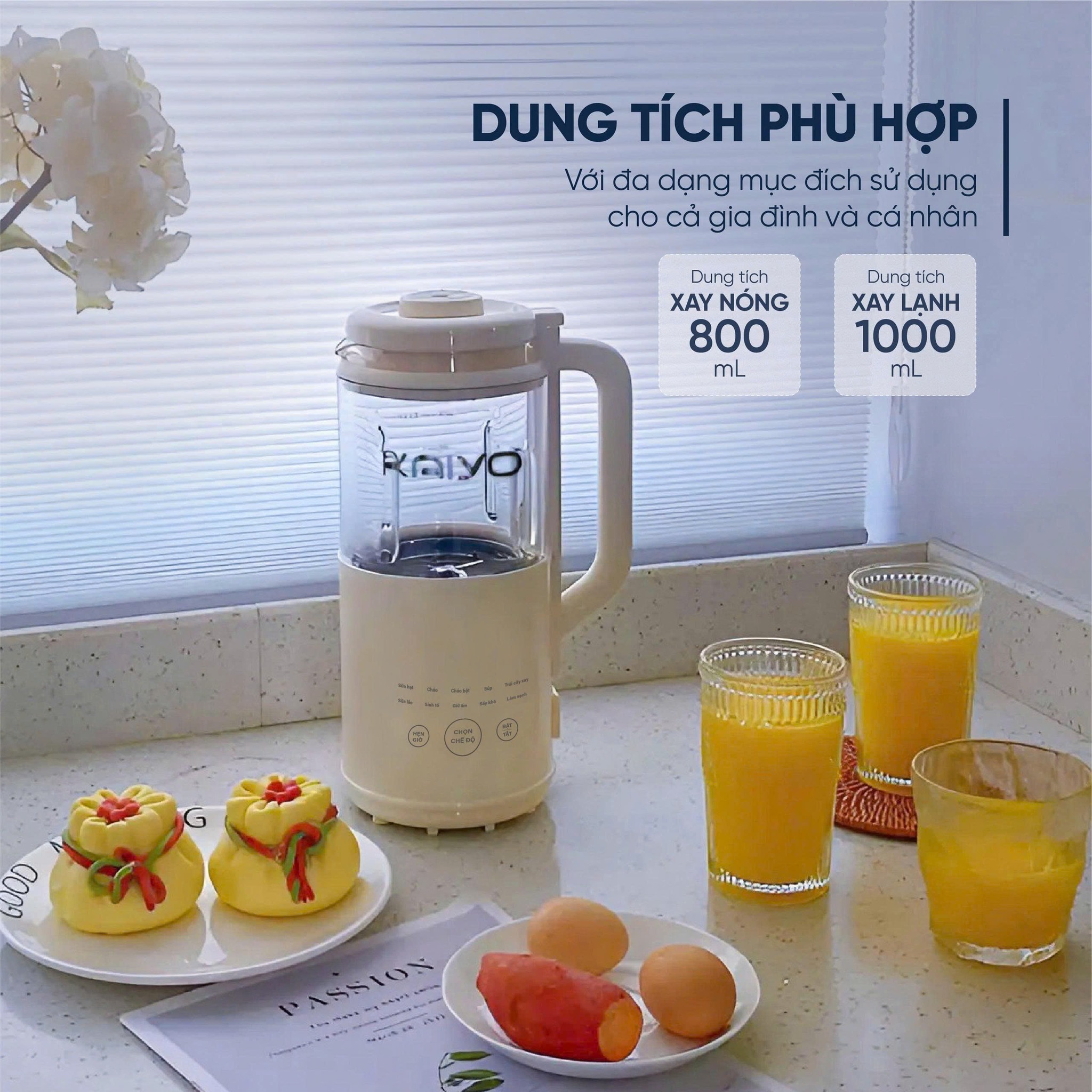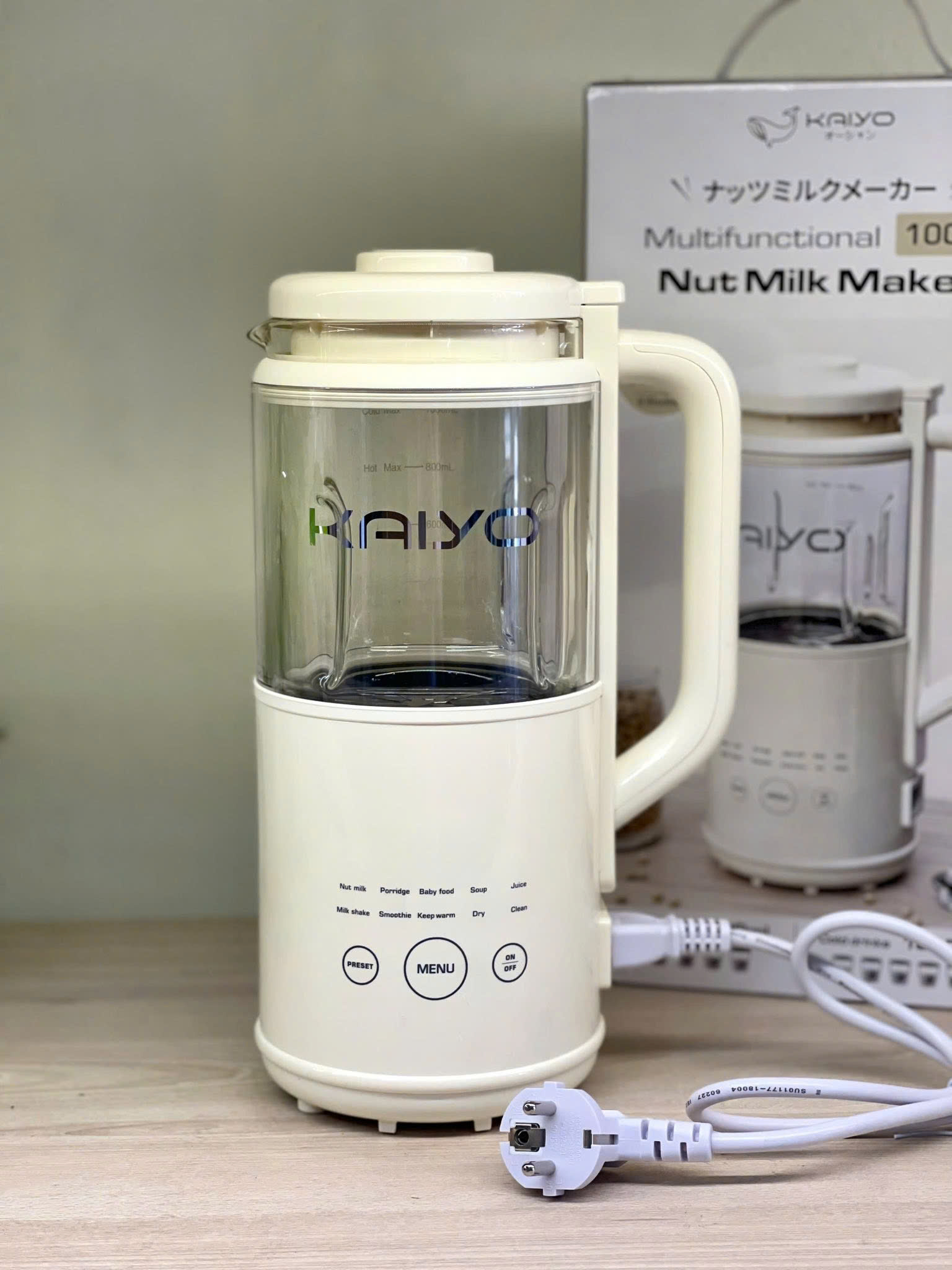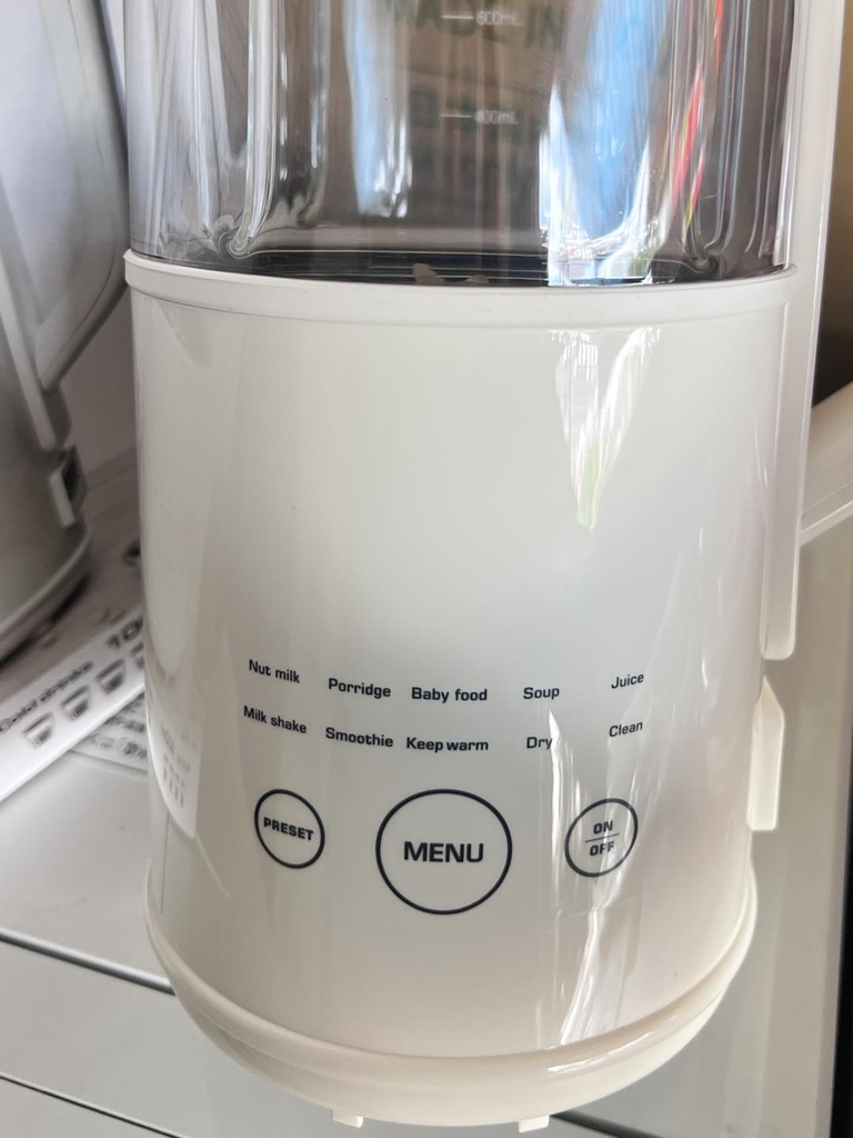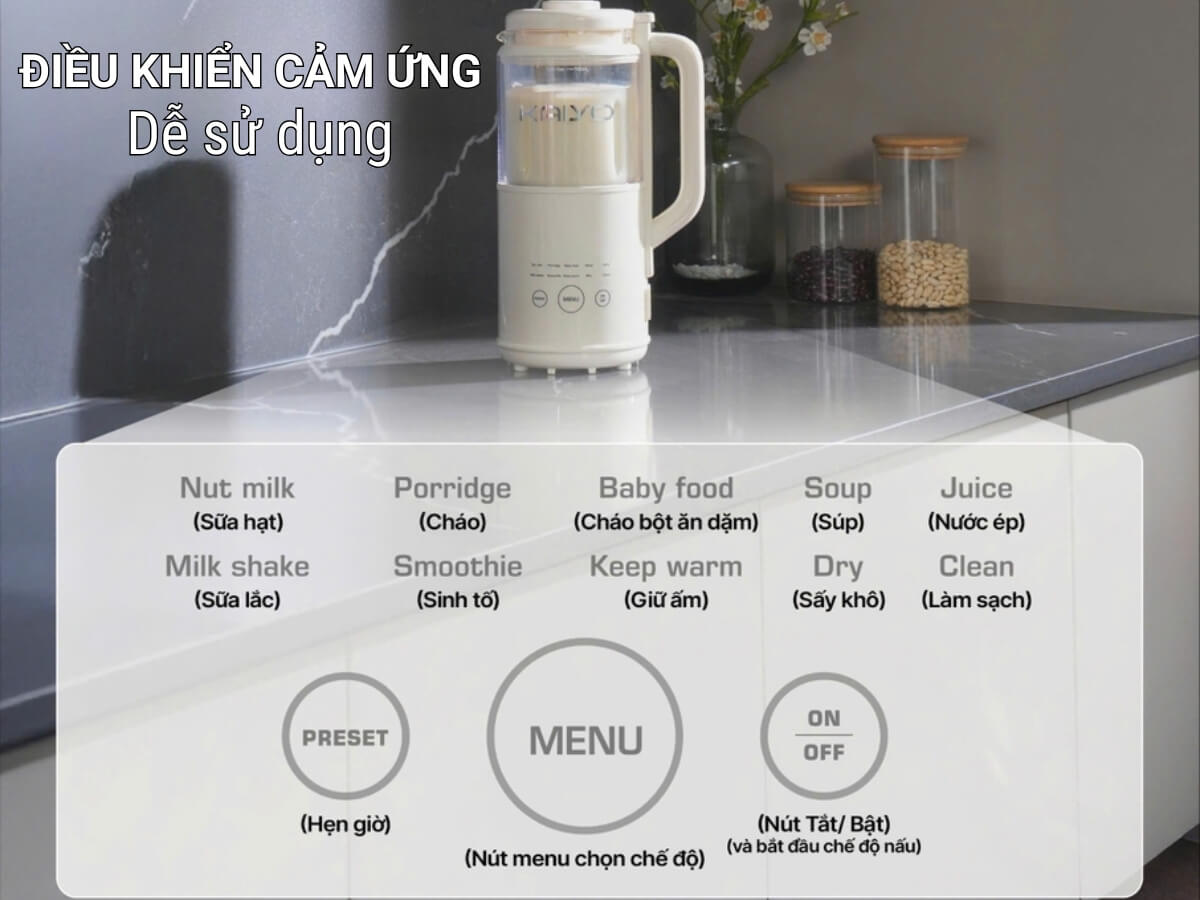 - 8 chế độ xay nấu được cài đặt sẵn: Làm sữa hạt (Nut Milk), Cháo (Porridge), Cháo bột ăn dặm (Baby food), Súp (Soup), Nước hoa quả (Juice), Sữa lắc (Milk Shake), Sinh tố (Smoothie), Giữ ấm (Keep Warm), Sấy khô (Dry), Clean (Làm sạch).