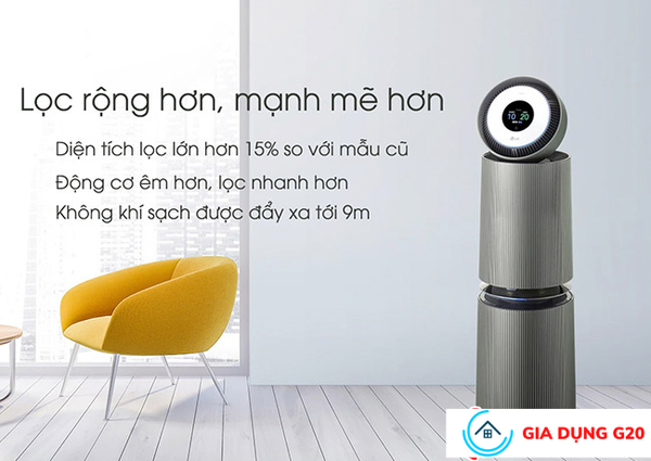 - Máy lọc không khí LG Puricare Alpha AS352NGHA tối đa 114m² với hệ thống quạt gió mạnh nhất của LG giúp máy hoạt động êm hơn, lọc nhanh hơn và diện tích lọc lớn hơn.