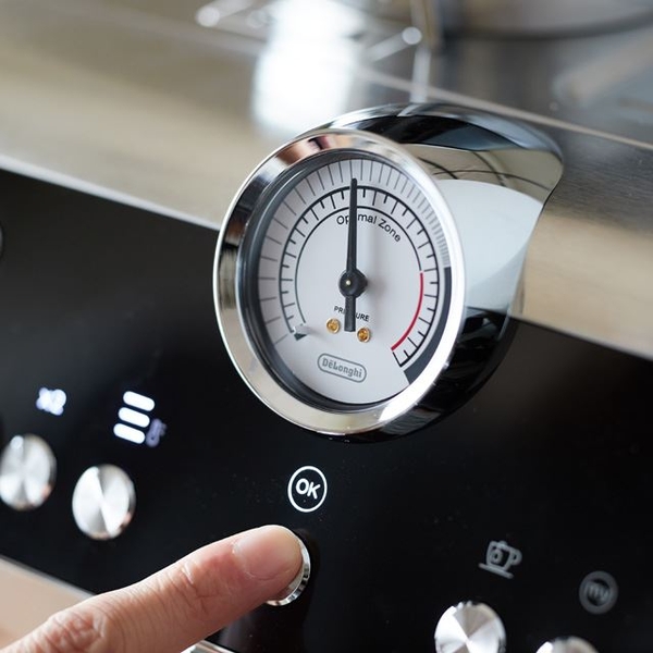 Áp kế ở mặt trước là một chỉ số chính xác để biết áp suất trong quá trình chiết xuất cà phê. Theo truyền thống, cà phê espresso được pha với áp suất từ 8 đến 10 bar. Trên máy pha cà phê De’longhi EC9155 MB, nó chỉ ra vùng lý tưởng hay còn gọi là Vùng tối ưu Optimal zone, nơi kim cần được định vị trong quá trình chiết suất. Sau đó, bạn sẽ biết liệu bạn có cần thay đổi độ mịn của hạt xay hoặc điều chỉnh lượng cà phê để đạt được chiết xuất hoàn hảo hay không.