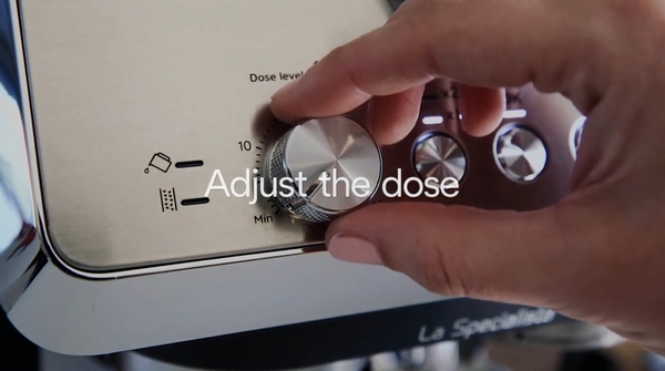 Đặt liều lượng cà phê được xay bằng cách xoay núm chọn liều lượng theo hướng tăng dần, bắt đầu từ lượng tối thiểu cho đến khi bạn đạt đến mức cà phê tối ưu được gợi ý bên trong bộ lọc. Nếu dùng phin đôi, bạn hãy nhấn thêm nút x2 bên cạnh, máy sẽ tự xay ra lượng cà phê gấp đôi cho bạn !