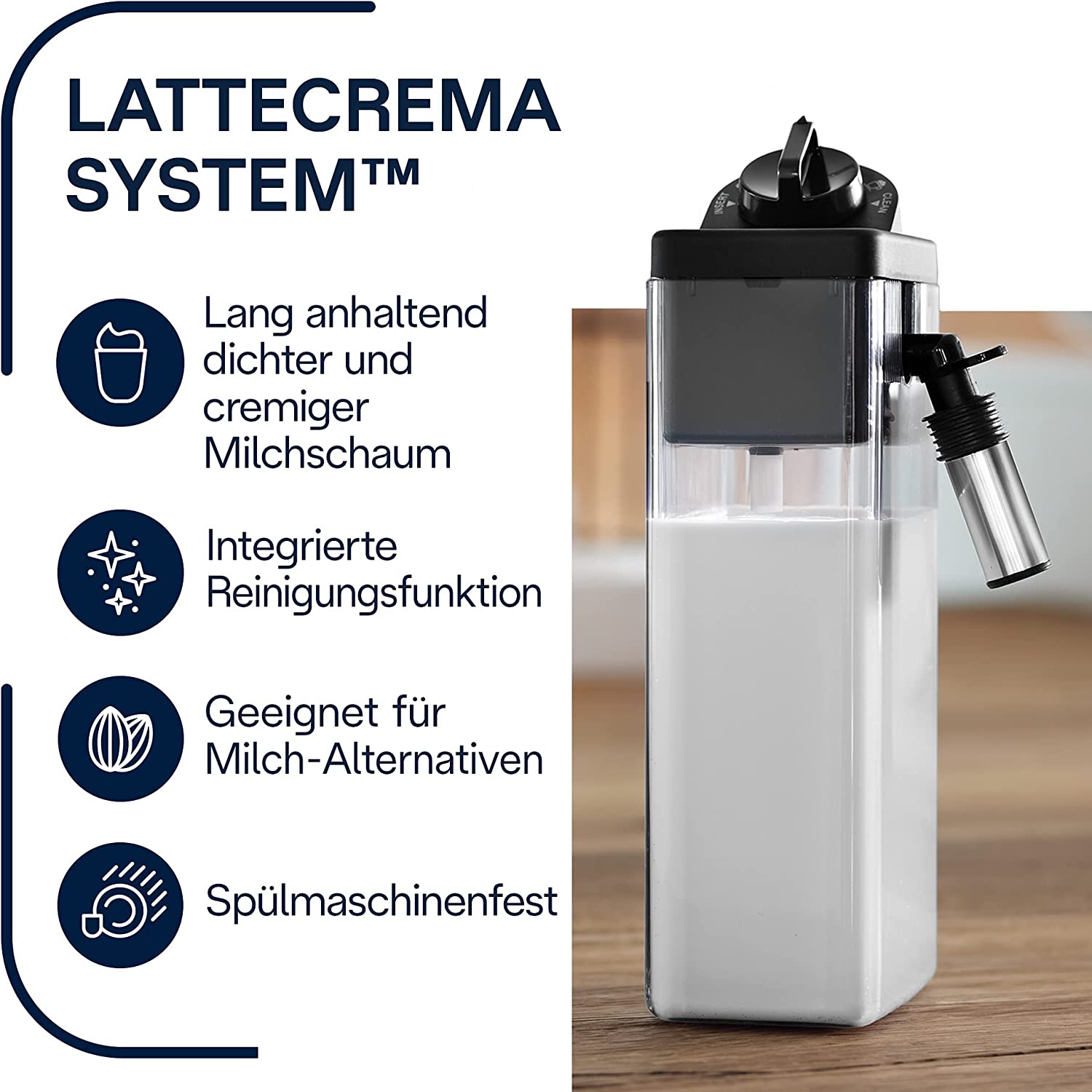 - Để làm cho những khoảnh khắc cà phê trở nên hoàn hảo ở mọi khía cạnh, De'Longhi cũng chú ý đến sự tiện lợi của việc sử dụng hệ thống đánh sữa, đó là lý do tại sao hệ thống LatteCrema, đánh bọt sữa, chỉ sử dụng lượng cần thiết để chuẩn bị bọt sữa, giữ phần không sử dụng trong bình.