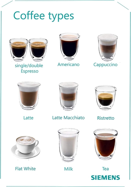 - Các chế độ pha: Cappuccino, Espresso, Sữa nóng, Cà phê crema, Latte Macchiato, Trà, Americano, Flat white