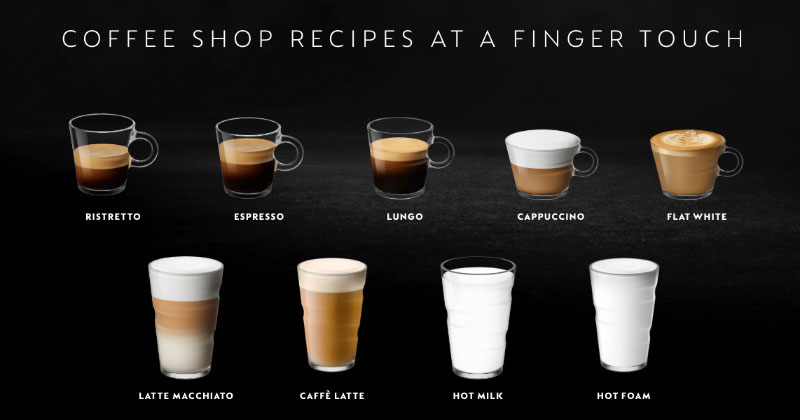 Thưởng thức các công thức cà phê và sữa thơm ngon chỉ bằng một nút bấm: Chuẩn bị ngay một ly Cappuccino đầy mê hoặc, Latte macchiato mịn, Flat white đậm đà hoặc Caffè latte kem. Bạn cũng có thể pha thêm bọt nóng cho cà phê hoặc thưởng thức một ly sữa nóng thư giãn. Không có tâm trạng pha cà phê? Chọn giữa một trong ba loại cà phê: Ristretto, Espresso và Lungo.