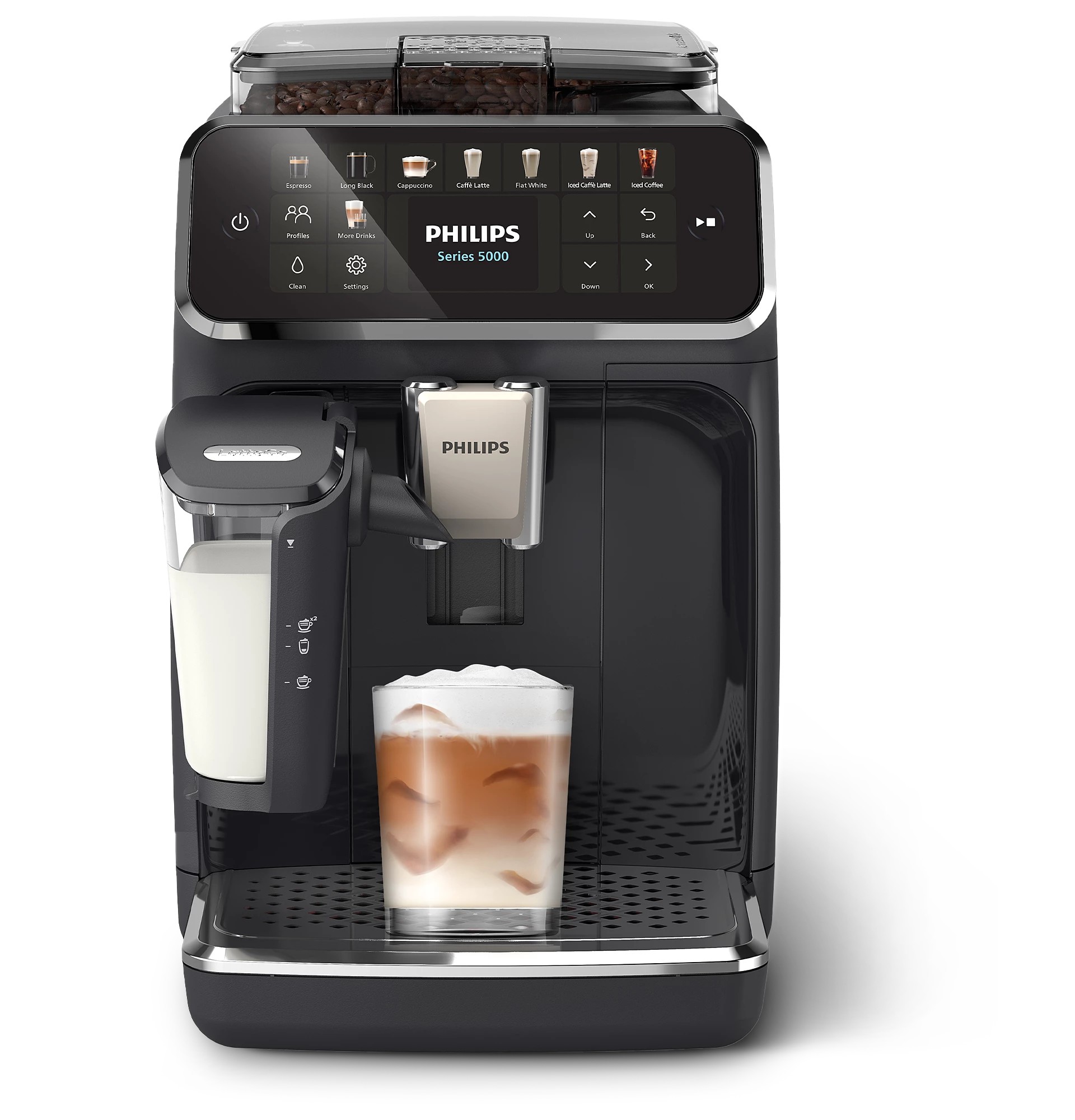 Máy pha café Philips EP5544/50 Series 5400 có chức năng tự động hoàn toàn từ hạt đến cà phê espresso cũng như cappuccino. Ngoài những nút nhấn về cà phê, chúng ta có thể khám phá cả một thế giới rộng lớn về thức uống với sữa như Caffeelatte, Latte Machiato, Flat White and Milk, bạn có thể dễ dàng lựa chọn những thức uống theo ý thích của mình. Với quy trình pha chế thông minh cho phép thưởng thức hương vị thơm ngon và cà phê ở nhiệt độ tối ưu từ cốc đầu tiên giúp bạn được thưởng thức những ly cà phê trọn vị nhất.
