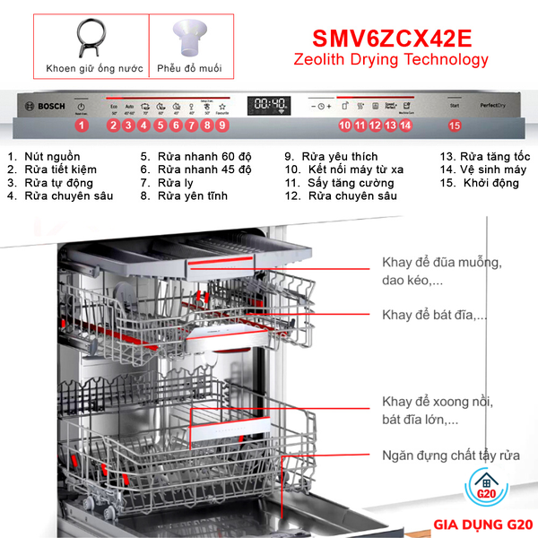 Thông số kỹ thuật chi tiết Máy rửa bát âm tủ Bosch SMV6ZCX42E Serie 6 sấy Zeolith