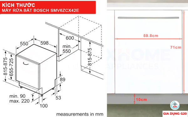Kích thước máy rửa bát Bosch serie 6 SMV6ZCX42E là 81.5 x 59.8 x 55 cm. Và tổng trọng lượng 46,2 kg. Đây là các chỉ số lý tưởng cho một chiếc tủ bếp âm toàn phần.
